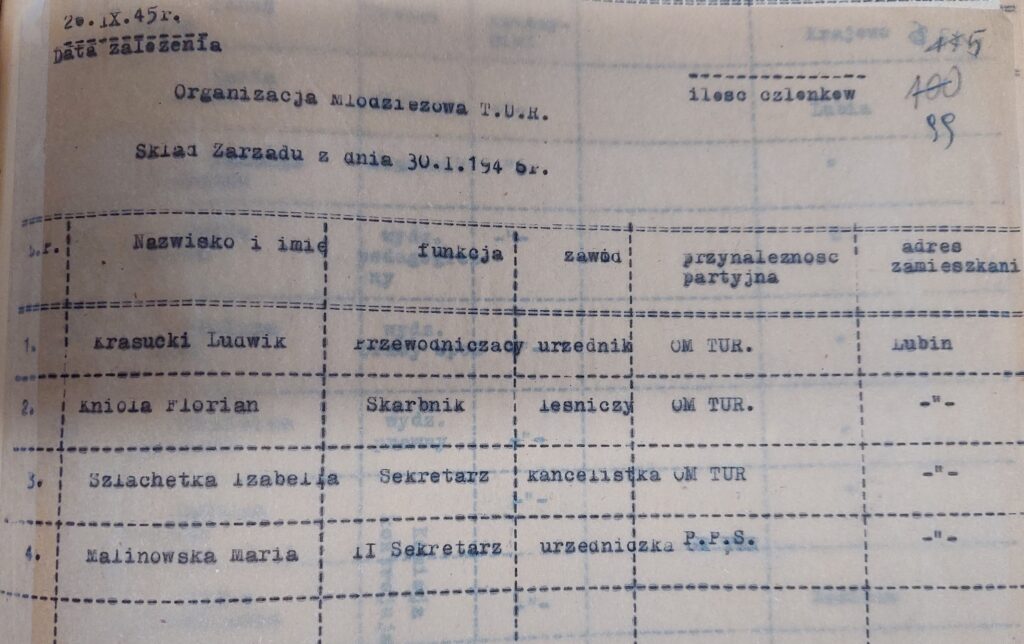 1 marca 1946 r. odbyło się walne zebranie organizacyjne, na którym powstał KS OM TUR „Zawisza” Lubin. W skład Zarządu weszli: J. Nowicki jako przewodniczący, Michał Czupiński – wiceprzewodniczący, Ludwik Krasucki – sekretarz, Mastalski – skarbnik oraz Wieczorek i Czyżewski jako członkowie Zarządu. Na dokumencie widzimy własnoręczne podpisy Nowickiego i Krasuckiego, którzy 2 marca prosili Pełnomocnika Rządu RP o zatwierdzenie klubu.
